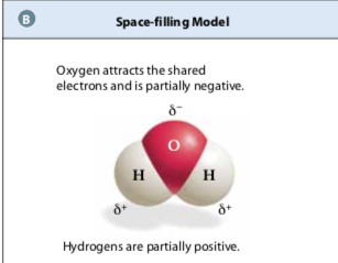 2 hydrogen atoms each share a pair of electrons with oxygen, forming covalent bonds in H2O. Since Oxygen is more electronegative than hydrogen, there is a partial negative charge on the oxygen and a partial positive charge on the hydrogens. Interactions Between Molecules: