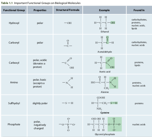 - Certain chemical properties are associated with certain functional groups. Hydroxyl or carbonyl groups found on a molecule will make the molecule polar. While, carboxyl will make a molecule acidic, resulting in it releasing a hydrogen atom for another molecule. Therefore, many functional groups participate in hydrogen bonding.