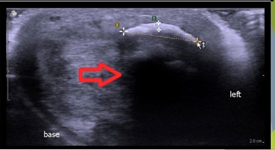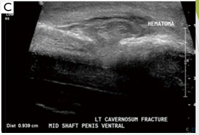 Scan through ventral aspect shows hypoechoic area within Rt corpus cavernosum, representing hematoma. Echogenic line of tunica albuginea intact representing no penile fracture
