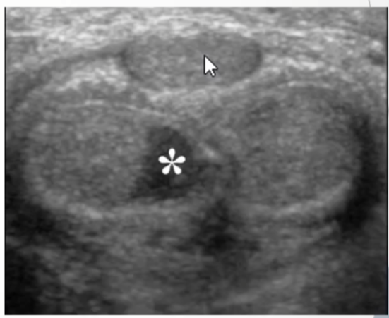 Longitudinal and Transverse images: Asterisk () demonstrates hypoechoic tumor which is confined to the subepithelial connective tissue and does not penetrate through or invade the tunica albuginea of the corpus cavernosa (arrows)*