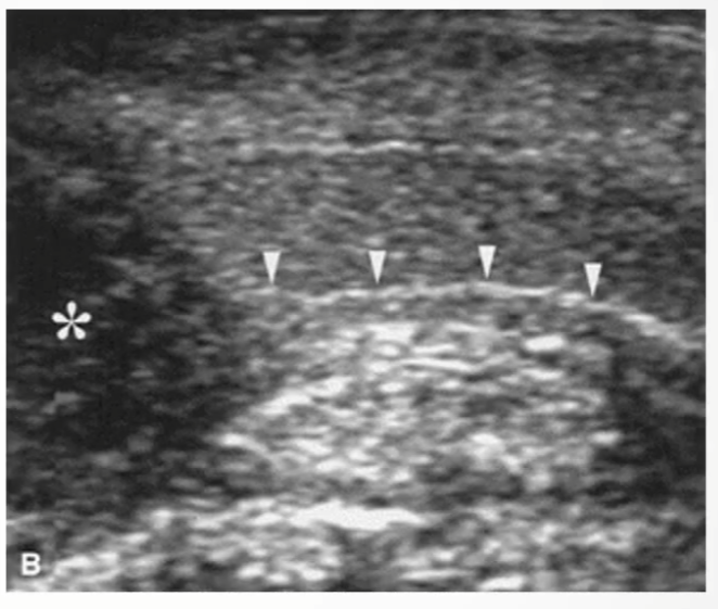 Longitudinal view demonstrating hypoechoic SCC () invading through the echogenic line of the tunica albuginea (arrowheads)*