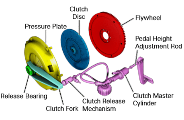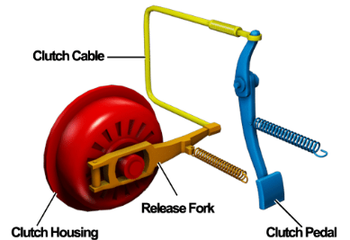 Operation: Pushing the clutch pedal pulls the cable and release fork, disengaging the pressure plate from the clutch.