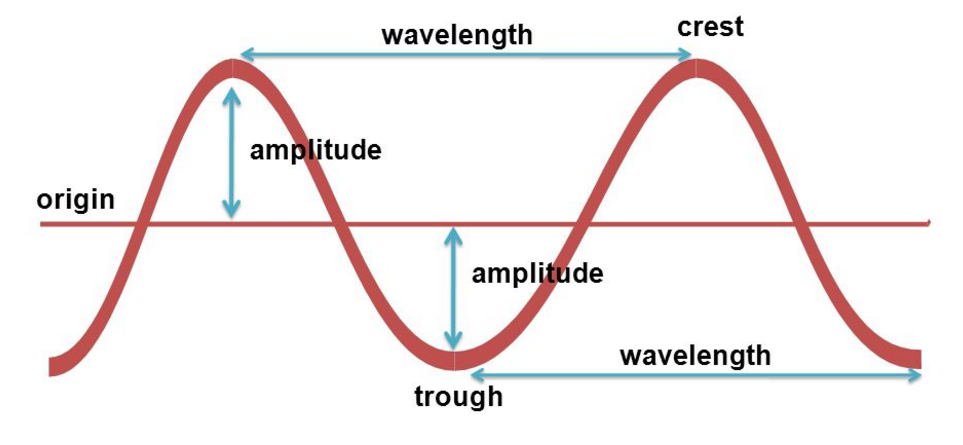 -wavelength= distance from one point on a wave to the same point on another wave, measured in metres (m)