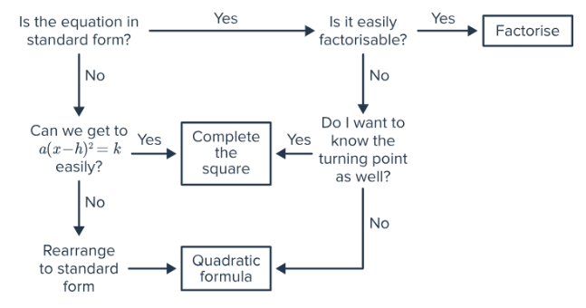 Factorising the quadratic expression and then using the null factor law. In particular, when the quadratic expression is non-monic, we can use techniques for non-monic quadratic trinomials.