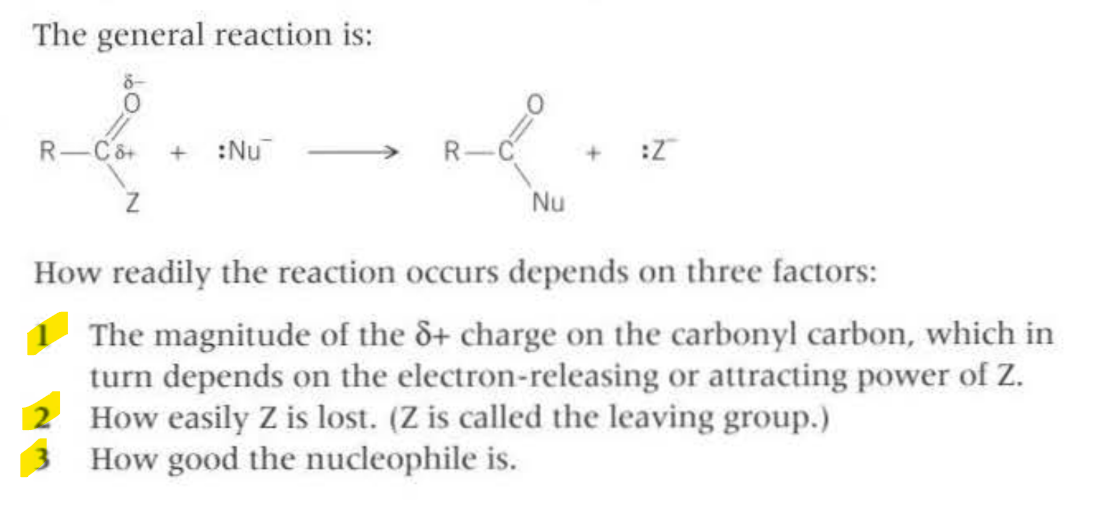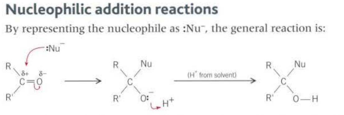The C=O bond is highly reactive, this is because of the large difference in the electrongeativity between the carbon and the oxygen. This causes the carbon to be slighly positive, so nucleophiles can attack (most reactions nucleophillic addition)