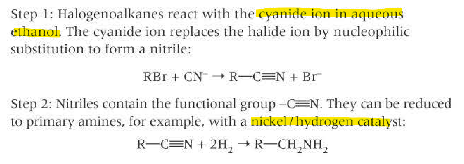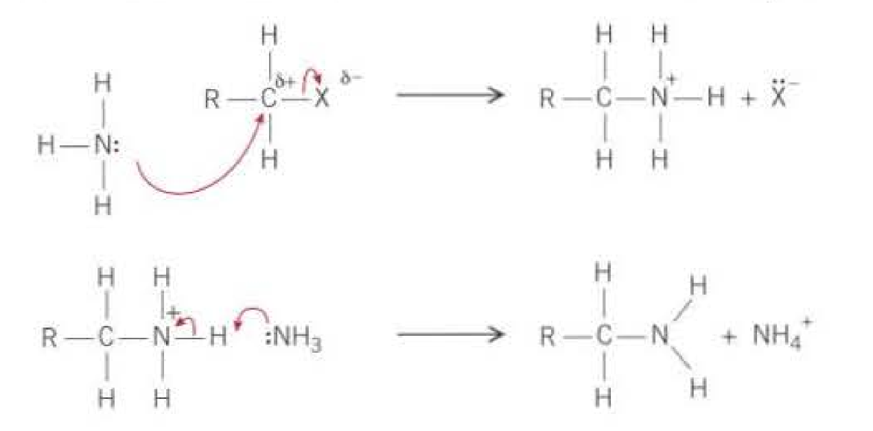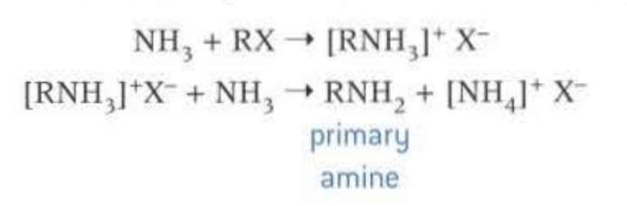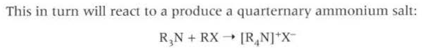Nucleophillic substitution, of halogenoalkane and ammonia. When there is an excess of ammonia then the primary amine is formed. When there is an excess of the halogenoalkane then the quaternary ammonia salt is formed, used for conditioners