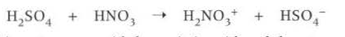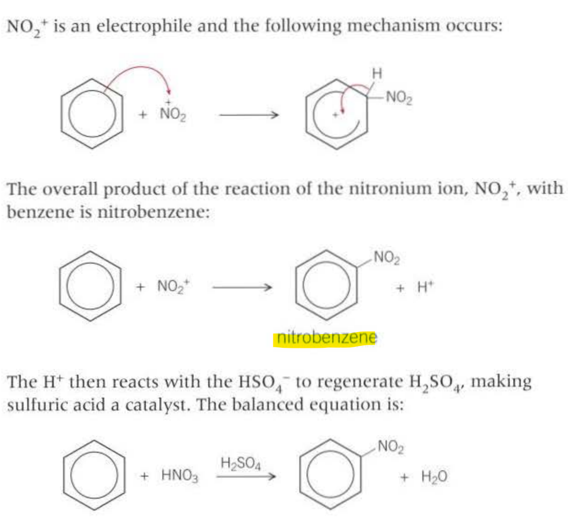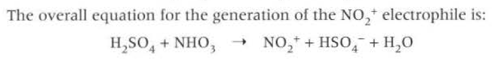 Nitration formuleas: When generating the electrophile (NO2+) is called the nitronium ion, the reagents and conditions are: CONC sufuric acid, CONC nitric acid