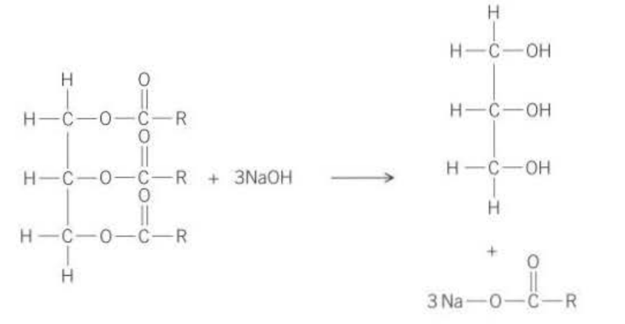 They can be hydrolysed using sodium hydroxide. Both products from hydrolysis are useful, the glycerol and mixture of sodium salts of the three acids that formed part of the ester. The salts are soaps. The glycerol (contains OH bonds so very soluble in water) is used as a solvent, in many medicines and in food industry (found in toothpaste)