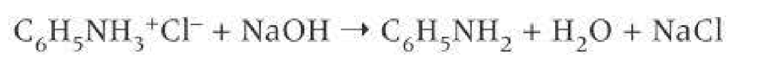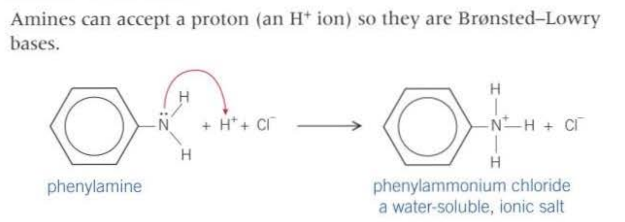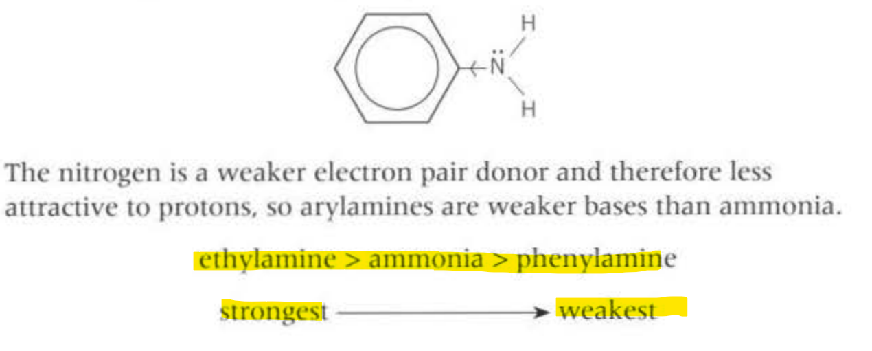 The key point is highlighted, the Phenylamine is the weakest, because the benzene ring withdraws electrons from the nitrogen making it more positive, so attracts the proton less than ethylamine, where the ethyl group forms a positive inductive effect.