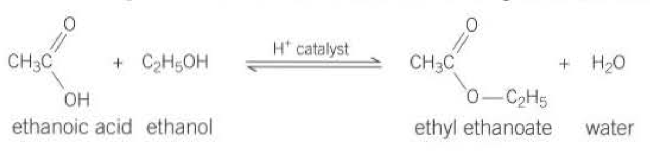 The OH from the carboxylic acids and the H from the alcohols leave and form water, and an ester is formed. To name an ester (the alcohol part then the carboxylic part such as ethyl ethanoate)