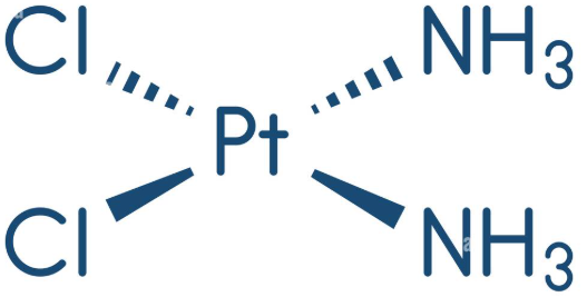 This works via a ligand substitution reaction, where when the cisplatin enters the chloride groups are replaced by water ligands, then these water ligands form hydrogen bonding between two adjacent guanime bases, this stops transcription and transulation for fastly dididing cells such as cancerous cells.