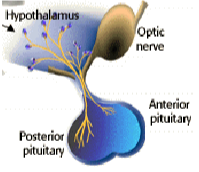Hormonal: hormones stimulate other organs - hypothalamic hormones stimulate the anterior pituitary gland.