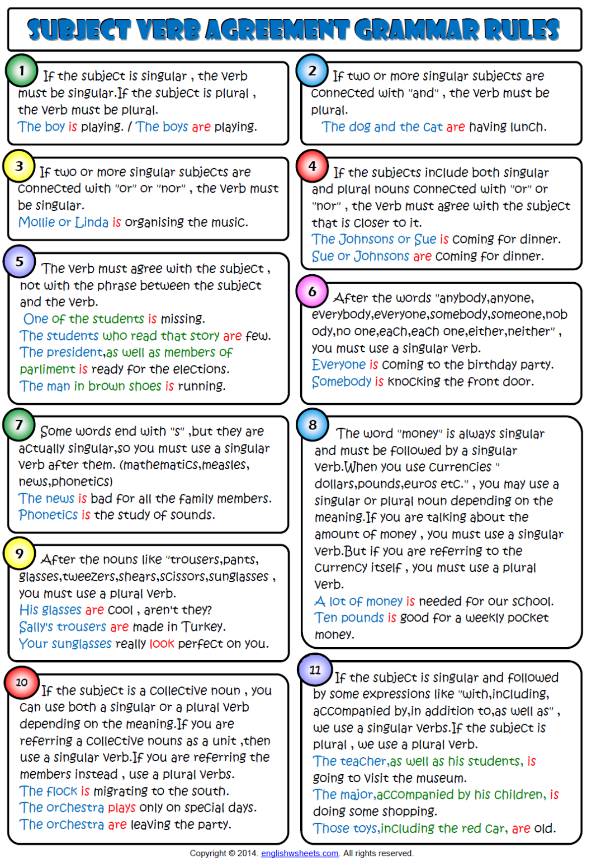 Subject-verb agreement means that a subject and its verb must be both singular or both plural: