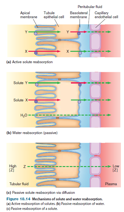 Passive Reabsorption of Solute Substance Z is passively reabsorbed via diffusion (Figure 18.14c). For this process to occur, two conditions must be satisfied: The concentration of Z must be greater in the tubular fluid than in the plasma, and Z must be able to permeate the plasma membranes of the tubule epithelium and the capillary endothelium. The tubular fluid, which came from plasma, has a higher concentration of Z than fluid in the capillary lumen, because most water that is filtered is reabsorbed as described earlier. As water leaves the lumen of the tubules and enters the plasma, the tubular concentration of Z increases, whereas the plasma concentration of this solute decreases. Therefore, Z diffuses down its concentration gradient from the tubular fluid to the plasma. Stated another way, reabsorption of molecules that can permeate membranes follows water reabsorption.