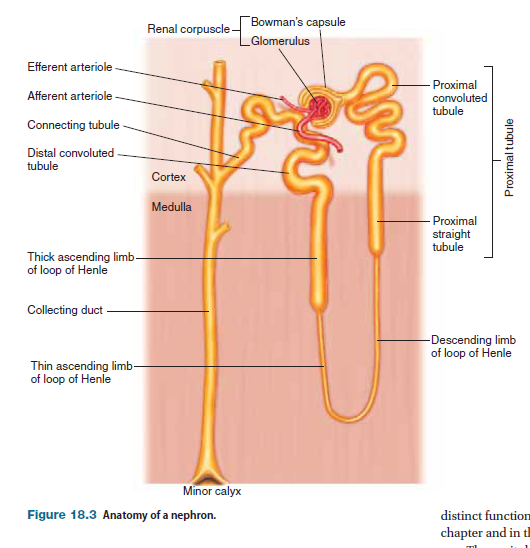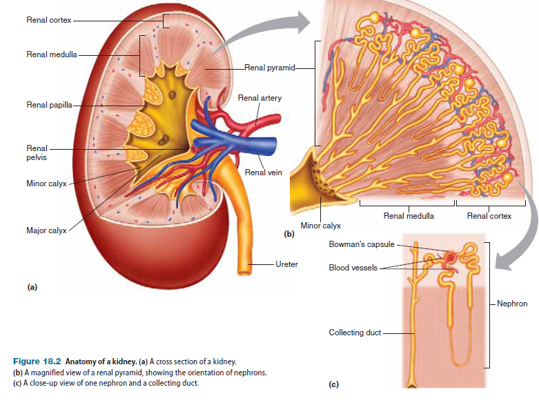A cross section of a kidney reveals that it contains two major regions: a reddish-brown outer layer called inner region called the medulla, which is darker and has a striped appearance (Figure 18.2a). The medulla is subdivided into a number of conical sections called renal pyramids (Figure 18.2b). At the tips of the renal pyramids, in the areas known as papillae (singular: papilla), tubules called collecting ducts drain into common passageways called minor calyces (singular: calyx; see Figure 18.2a). The minor calyces converge to form two or three larger passageways called major calyces, which drain into a single funnel-shaped passage called the renal pelvis, the initial portion of the ureter. Within a kidney’s many renal pyramids are more than a million microscopic subunits called nephrons (Figure 18.2c), which are the functional units of the kidneys; they do the work of filtering the blood and forming the urine. The most obvious feature of the nephron is a long, coiled tube (called a renal tubule) that forms a hairpin loop about midway along its length. During the process of urine formation, fluid flows through the renal tubules, during which time the fluid’s composition is modified by exchange with the interstitial fluid.Fluid from individual tubules eventually drains into a set of common passageways called collecting ducts, where the composition of the fluid is further modified. The fluid that exits the collecting ducts and flows through the renal pelvis to the ureters is called urine.