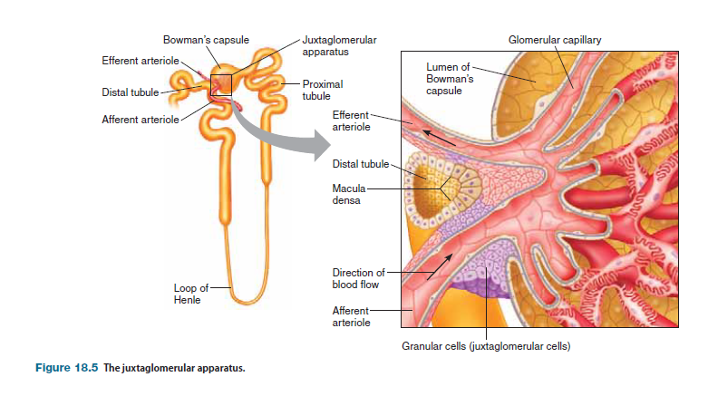 The juxtaglomerular apparatus has two components: (1) a specialized cluster of the tubule’s epithelial cells, called the macula densa, and (2) granular cells (or juxtaglomerular cells) in the wall of the afferent (and to a lesser extent the efferent) arterioles. Granular cells are named based on the presence of numerous cytoplasmic secretory granules that contain a product called renin. The juxtaglomerular apparatus plays an important role in regulating blood volume and blood pressure