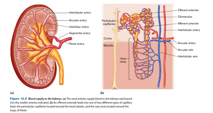 Within the kidney, the renal artery branches into segmental arteries, which in turn branch into a number of smaller interlobar arteries, which then feed into another set of arteries called arcuate arteries. The arcuate arteries branch into interlobular arteries, from which blood is carried to individual nephrons by the afferent arterioles, which next lead into the glomerular capillary beds. Coming off each of the glomerular capillary beds is the efferent arteriole, which then gives rise to one of two types of capillary beds (Figure 18.6b): (1) peritubular capillaries, which branch from the efferent arterioles of cortical nephrons and are located close to the renal tubules, and (2) vasa recta, which branch from the efferent arterioles of juxtamedullary nephrons and are networks of blood vessels forming hairpin loops that run along the loops of Henle and collecting ducts, dipping deep into the renal medulla. Each of these capillary beds has a distinct function in the formation of urine. The peritubular capillaries and vasa recta drain into the interlobular veins. From here, blood is carried away from nephrons by the arcuate veins, and then by the interlobar veins, which run parallel to their respective arterial counterparts, eventually draining into the renal vein.