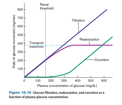 However, the true renal threshold for glucose is 160–180 mg/dL. At these plasma levels of glucose, the filtered load of glucose is approximately 225 mg/min. Although this value is considerably lower than the transport maximum for glucose, some glucose molecules in the filtrate avoid contact with carrier proteins and, therefore, are excreted in the urine even though the carrier proteins are not 100% saturated. (Notice the nonlinear relationship between glucose reabsorption and excretion rates and plasma concentration of glucose as the rates approach the maximum in Figure 18.16.)