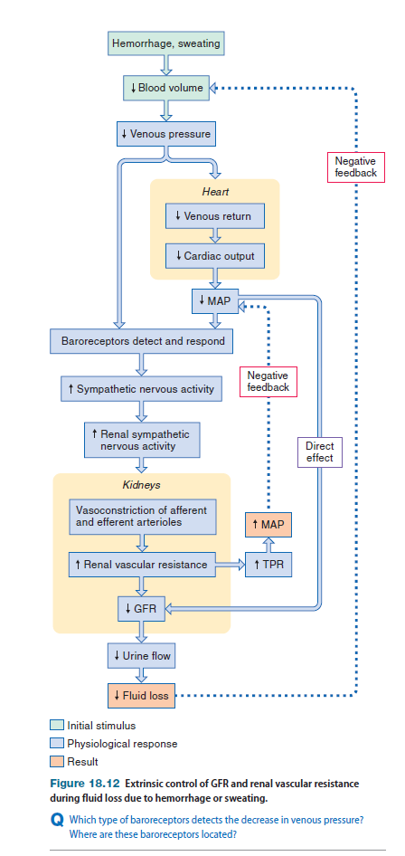 shows what happens when the mean arterial pressure falls due to hemorrhage or excessive sweating. When MAP falls to less than 80 mm Hg, GFR decreases directly due to the lowered filtration pressure. In addition, the fall in MAP triggers an increase in sympathetic nervous activity via baroreceptor reflexes. In response to increased input from sympathetic nerves, smooth muscle in the afferent and efferent arterioles contracts, and both afferent and efferent arterioles constrict, which increases the overall resistance of the renal vasculature and decreases the GFR. The increase in renal vascular resistance acts to decrease renal blood flow and also raises the total peripheral resistance, which in turn increases MAP. The decrease in GFR also decreases urine output, which helps the body conserve water. This process minimizes reductions in blood volume, which in turn counteracts further decreases in arterial pressure.