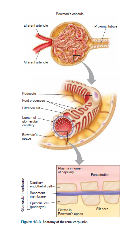 The wall of Bowman’s capsule and the wall of the renal tubule are composed of a continuous layer of epithelial cells. In Bowman’s capsule, this epithelium folds upon itself to envelop the glomerular capillaries. Below the epithelium is a basement membrane that acts as the primary filtration barrier for proteins. The glomerular filtrate must cross three barriers to enter Bowman’s capsule: (1) the capillary endothelial cell layer, (2) the surrounding epithelial cell layer, and (3) the basement membrane that is sandwiched between them. The combination of these three layers makes up what is called the glomerular membrane or filtration barrier. The epithelial cells that cover the glomerular capillaries have special extensions or foot processes, giving them their name podocytes. As fluid moves out of the glomerular capillaries, it passes through gaps between the podocytes, called slit pores. The sizes of slit pores are regulated by slit diaphragms. The presence of fenestrations (pores) in the capillary endothelium, the large number of slit pores in the surrounding capsule epithelium, and the large surface area of the filtration barrier combine to make the renal corpuscle favorable for the bulk flow of protein-free fluid between blood and the lumen of Bowman’s capsule (called Bowman’s space). The sum of the Starling forces in the renal corpuscle is called the glomerular filtration pressure, which is analogous to the netfiltration pressure. Four Starling forces play key roles in glomerular filtration.