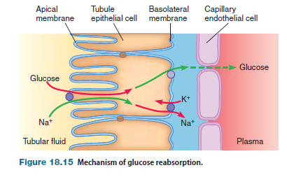 Figure 18.16 shows the relationship between the plasma concentration of glucose and the handling of glucose by the kidneys. The transport maximum for glucose reabsorption is 375 mg/min. The normal plasma glucose level is 80–100 mg/dL. Given that GFR is 125 mL/min (=1.25 dL>min), the filtered load of glucose when its plasma concentration is 100 mg/dL is