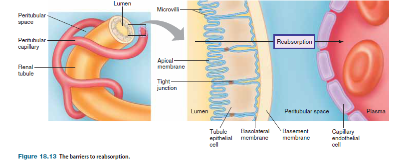 Capillaries are a barrier only to movement of macromolecules, such as proteins, and cells. Thus the epithelial cells lining the renal tubules form the primary barrier to reabsorption of the various solutes. Because tight junctions connect the epithelial cells lining the renal tubules, movement of molecules between cells is restricted. The plasma membrane of the epithelial cells facing the tubule lumen is called the apical membrane and has microvilli; the plasma membrane facing the interstitial fluid is called the basolateral membrane. Microvilli on the apical membrane are abundant in the more proximal portions of the tubule but are sparse in the distal portions. Beneath the basolateral membrane is a basement membrane that does not contribute significantly as a barrier. Some molecules are passively reabsorbed, whereas others require energy.