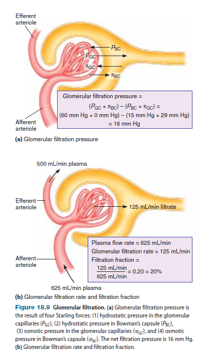 Filtration fraction =GFR/renal plasma flow=125 mL/min/625 mL>min = 0.20 = 20%