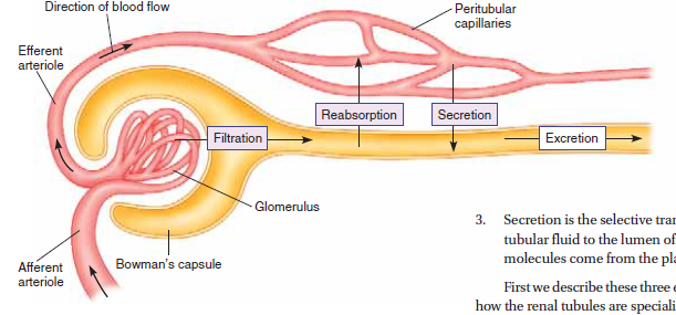 3. Secretion is the selective transport of molecules from the peritubular fluid to the lumen of the renal tubules. These secreted molecules come from the plasma of the peritubular capillaries. First we describe these three exchange processes; then we look at how the renal tubules are specialized for reabsorption and secretion.