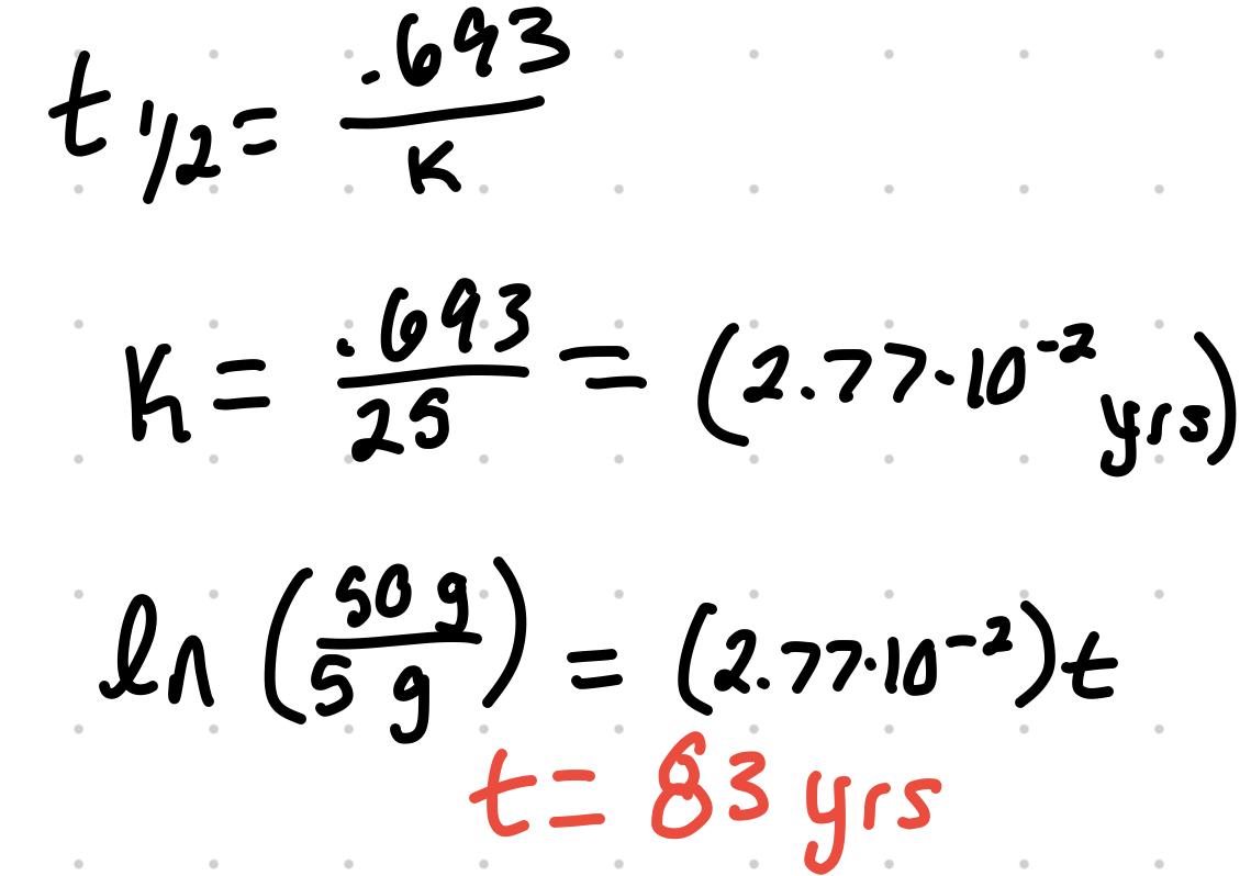 How many years of 50 µg of Pb 210 takes to decrease to 5.0µg ( t(½) =25yrs)