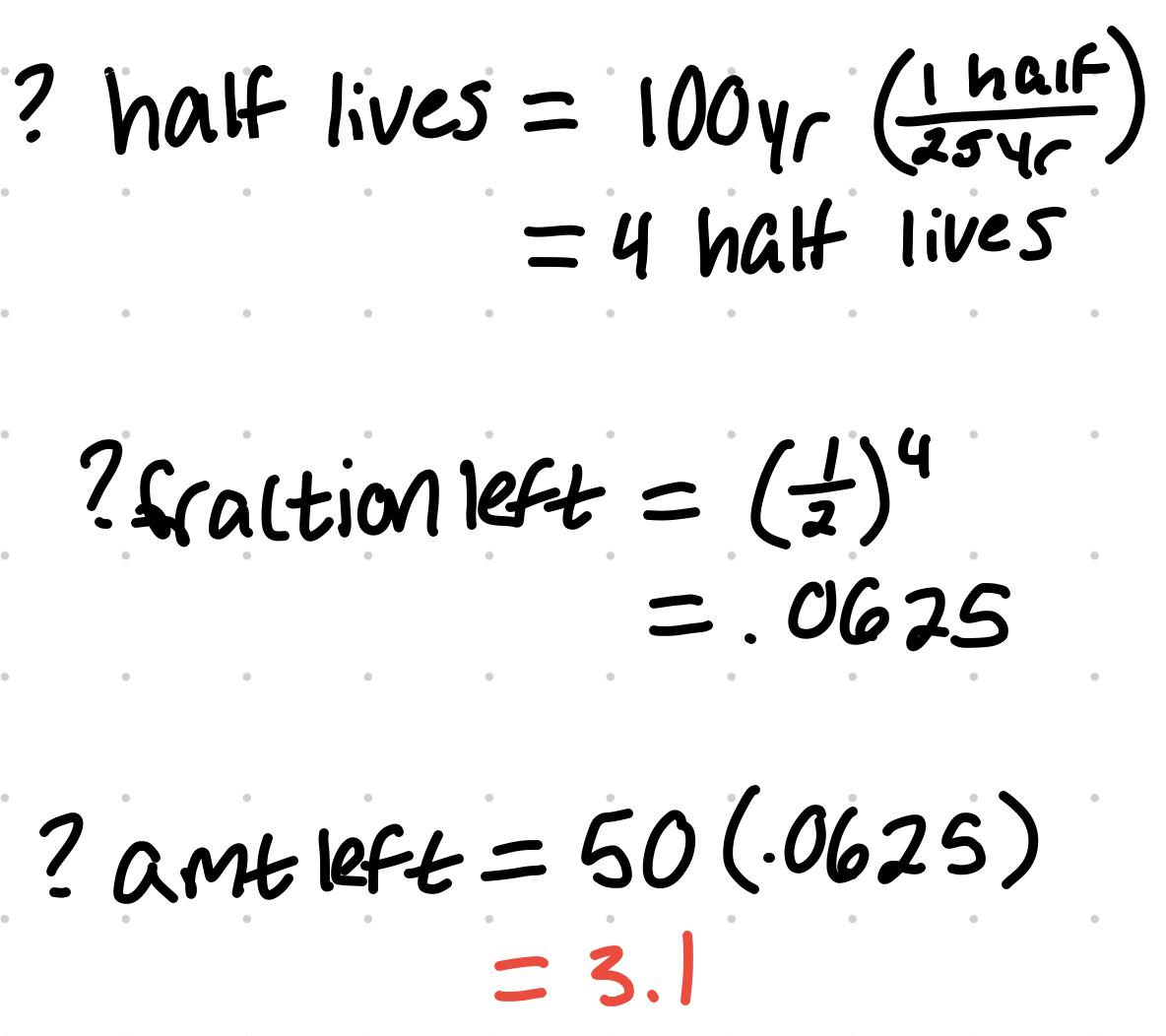 The half life of Pb 210 is 25 years. In a sample of 50 µg of Pb 210, how much is left after 100 years