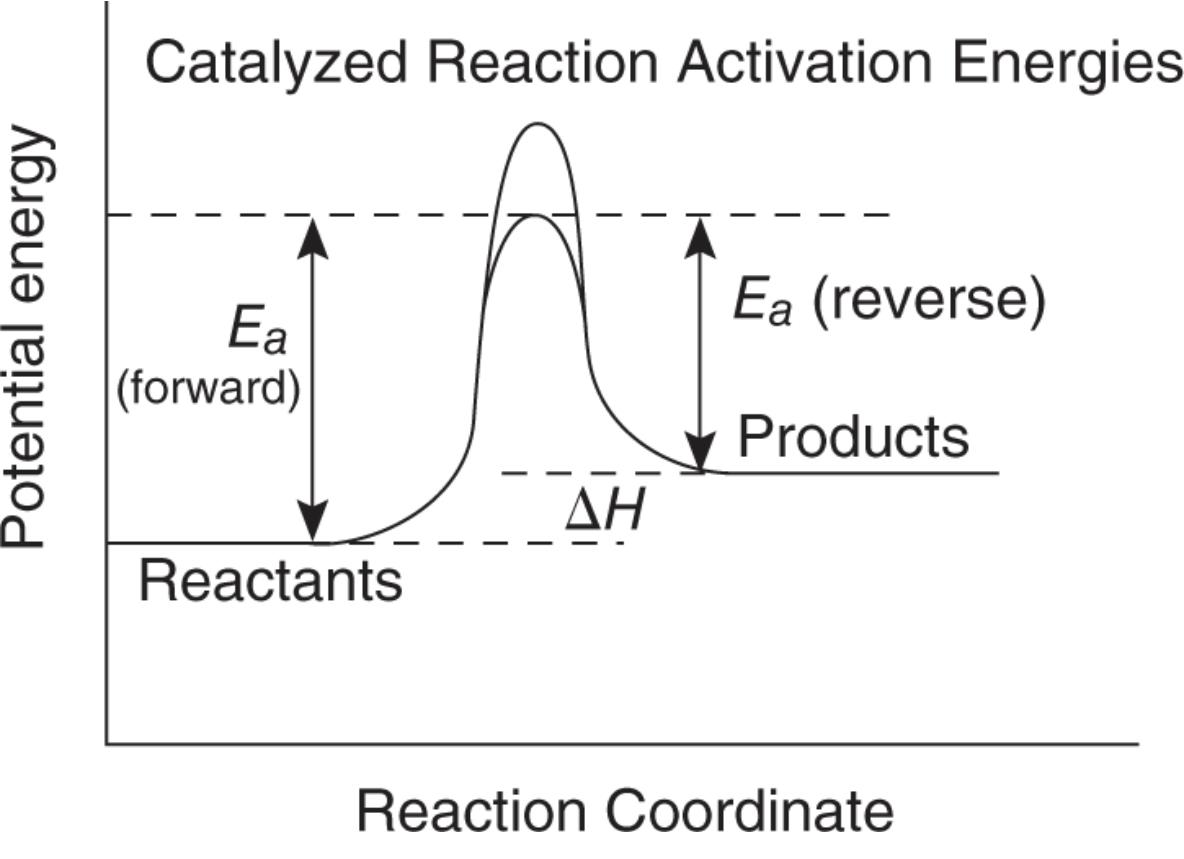 - Catalysts increase reaction rate by lowering activation energy, or energy required for reaction to start. It does not appear in balanced equation