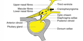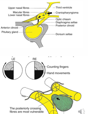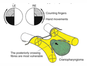 generally being involved first in lesions that expand from above the chiasm (e.g., craniopharyngioma).