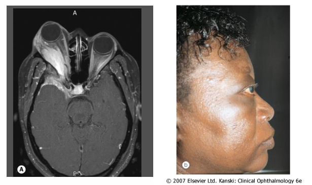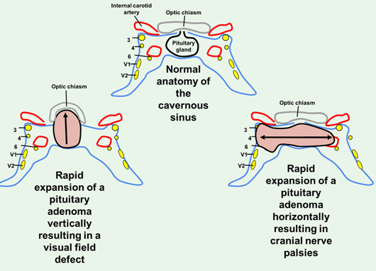 Abnormal corneal and facial sensation from compression of cranial nerve V in the cavernous sinus.
