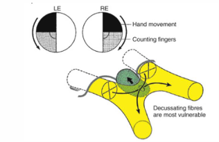 Leading to bitemporal field defects (heteronymous). Respects horizontal midline