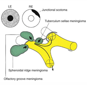 Tuberculum sellae meningioma compresses at the junction of the optic nerve and chiasm leading to a junctional scotoma.