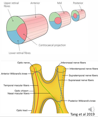 Infero-nasal fibers traverse chiasm inferiorly and anteriorly