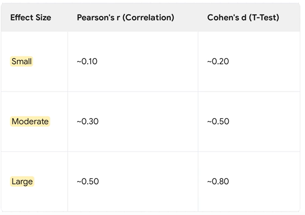 Cohen’s d (effect size for t-tests): interpret via conventional small/medium/large cutoffs (context-dependent). (Cutoffs vary by source; common conventions include small ≈ 0.2, medium ≈ 0.5, large ≈ 0.8 in many fields.)
