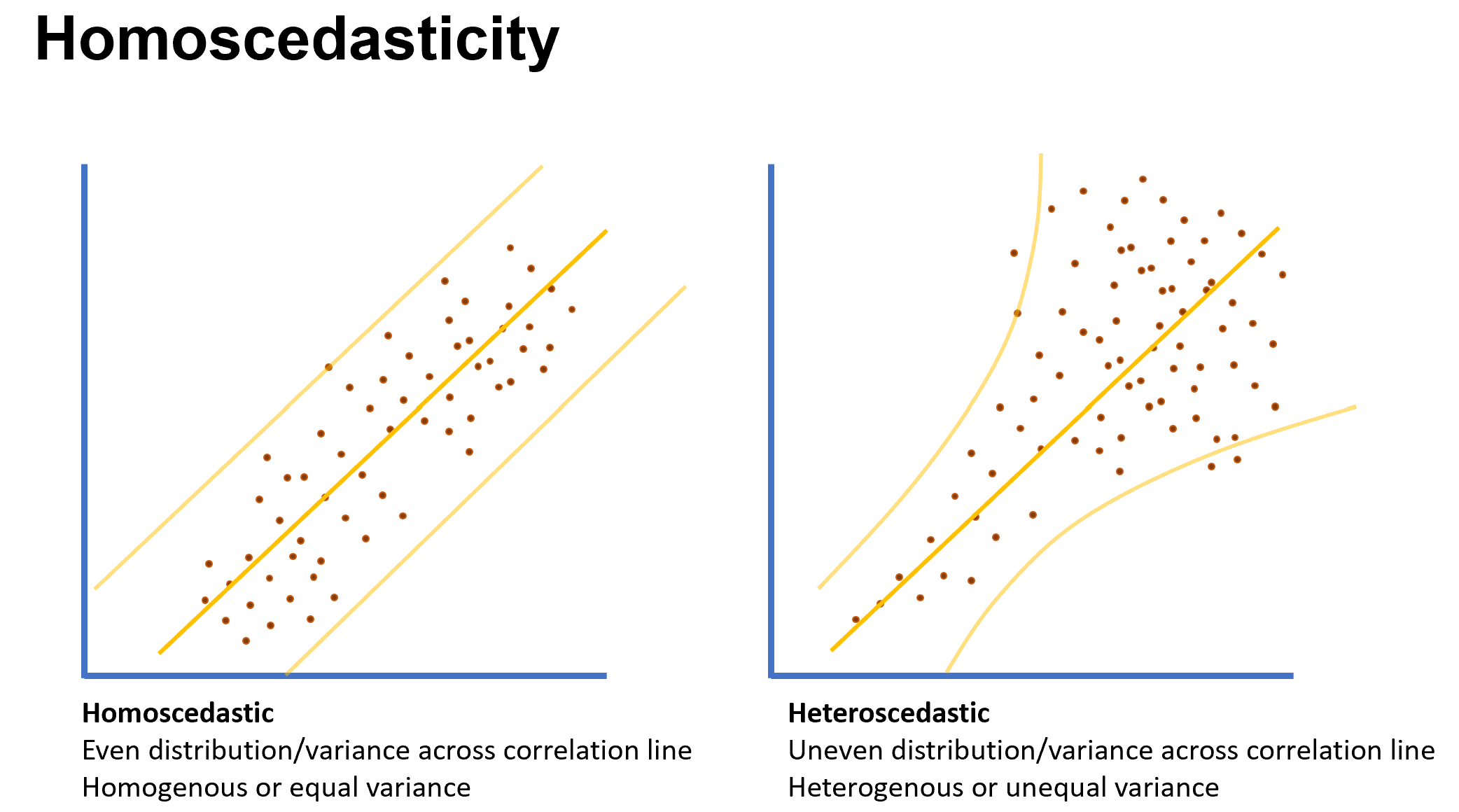Right plot: data are heteroskedastic (unequal variance across the correlation line; data fan out or cluster as you move along the axes).