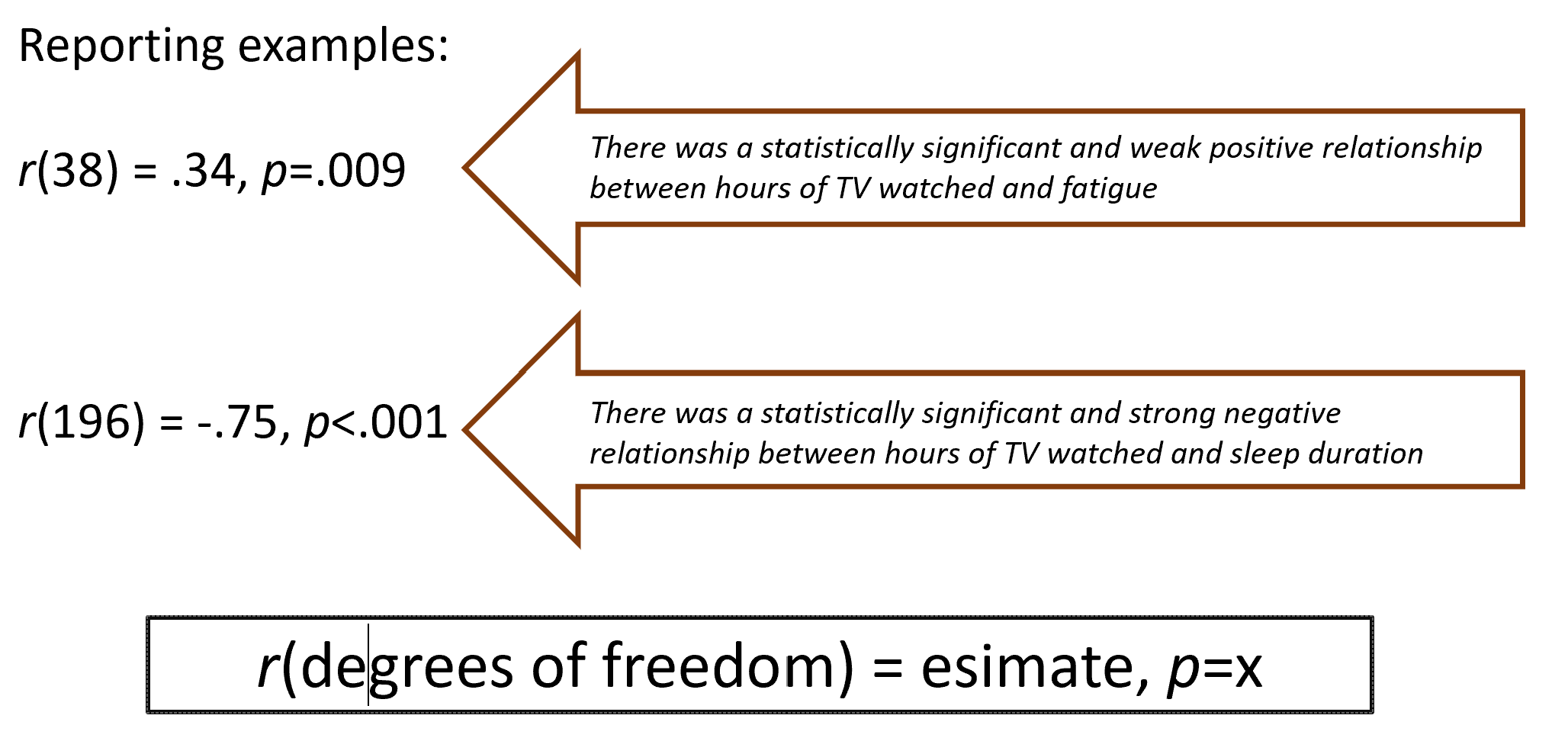 Example reporting: r(df) = 0.34,\quad p = 0.009 or r(df) = -0.75,\quad p < 0.001
