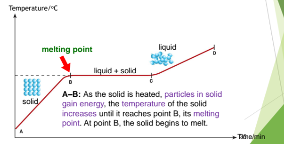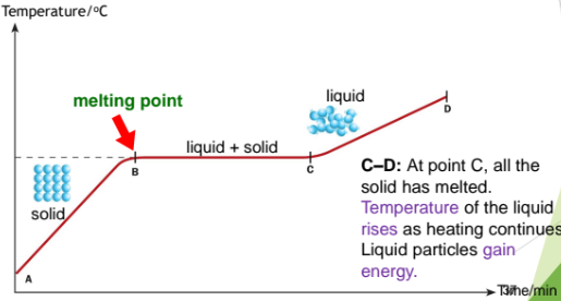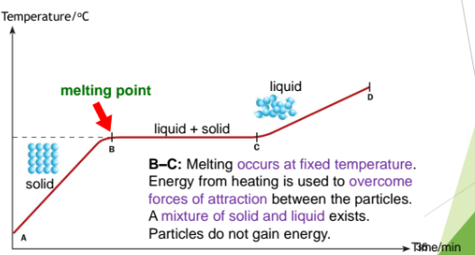 From B to C: Melting occurs at fixed temperature. Energy from heating is used to overcome forces of attraction between the particles. A mixture of solid and liquid exists. The particles so not gain energy.