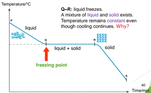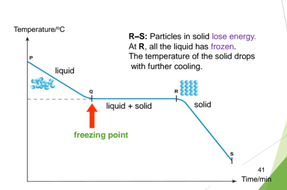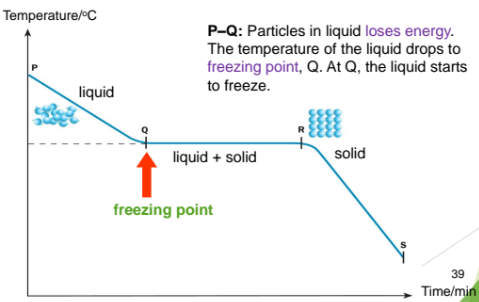 From P to Q: Particles in the liquid loses energy. The temperature of the liquid drops to freezing point, Q. At Q, the liquid starts to freeze