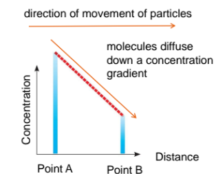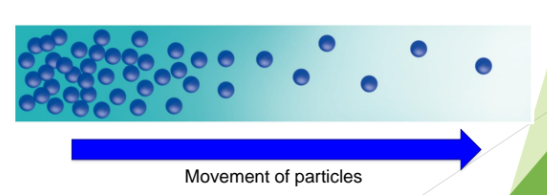 Diffusion is the net movement of particles from a region where they are of higher concentration to a region where they are of lower concentration, that is, down a concentration gradient