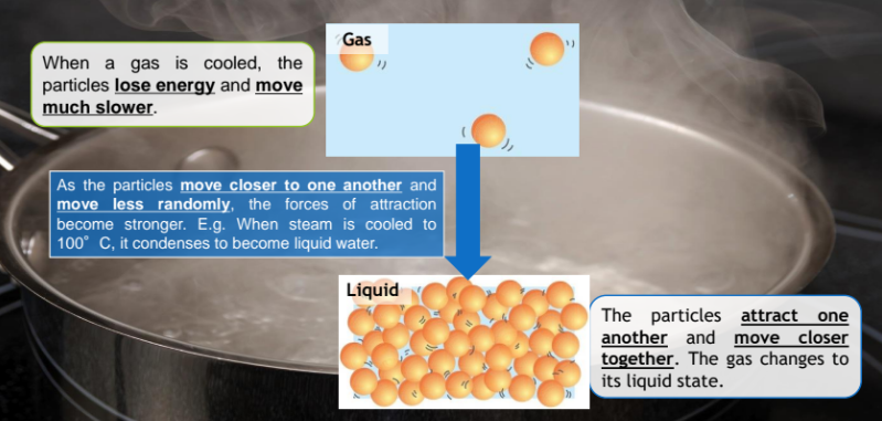 As the particles move closer to one another and move less randomly, the forces of attraction become stronger. E.g. When steam is cooled 100°C, it condenses to become liquid water.