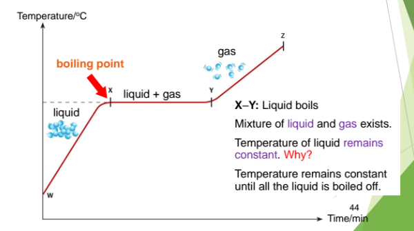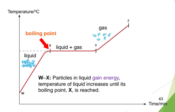 W-X: Particles in liquid gain energy, temperature of liquid increases until its boiling point, X, is reached