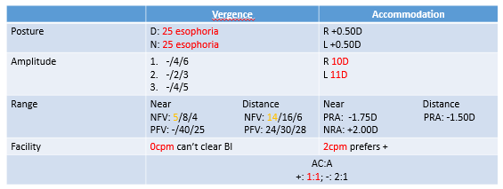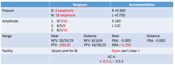 Symptoms: Headaches when doing near work (after >2 hours), diplopia at the end of the day when tired.