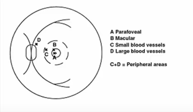 C+D = Peripheral Areas: Fixation outside the macular region, potentially near small or large blood vessels.