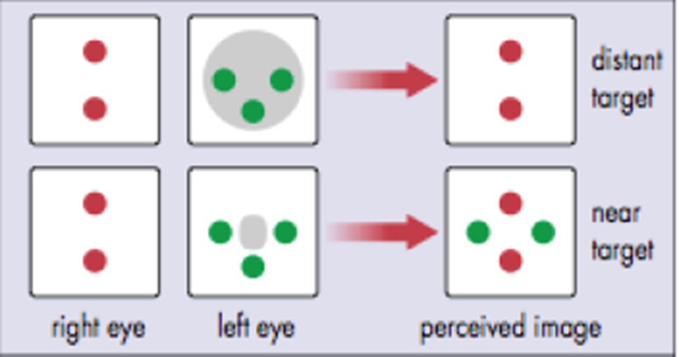 Diplopia: Patient sees 5 dots (e.g., 2 red and 3 green spatially separated).