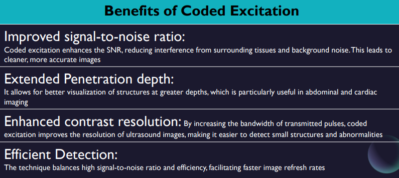 Coded excitation in ultrasound imaging resolves this issue by increasing the bandwidth of transmitted pulses. This means clinicians can achieve high-resolution images even at deeper tissue levels.