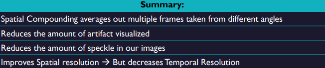 reduces speckle, When the images are compounded, the different speckle patterns at each point in the image are averaged.