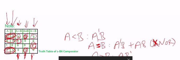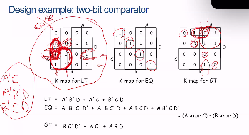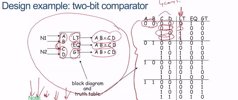 For a two-bit one, inputs would be AB CD, and compare it through LT, EQ, GT(less than, equal to, greater than) of AB > = < CD